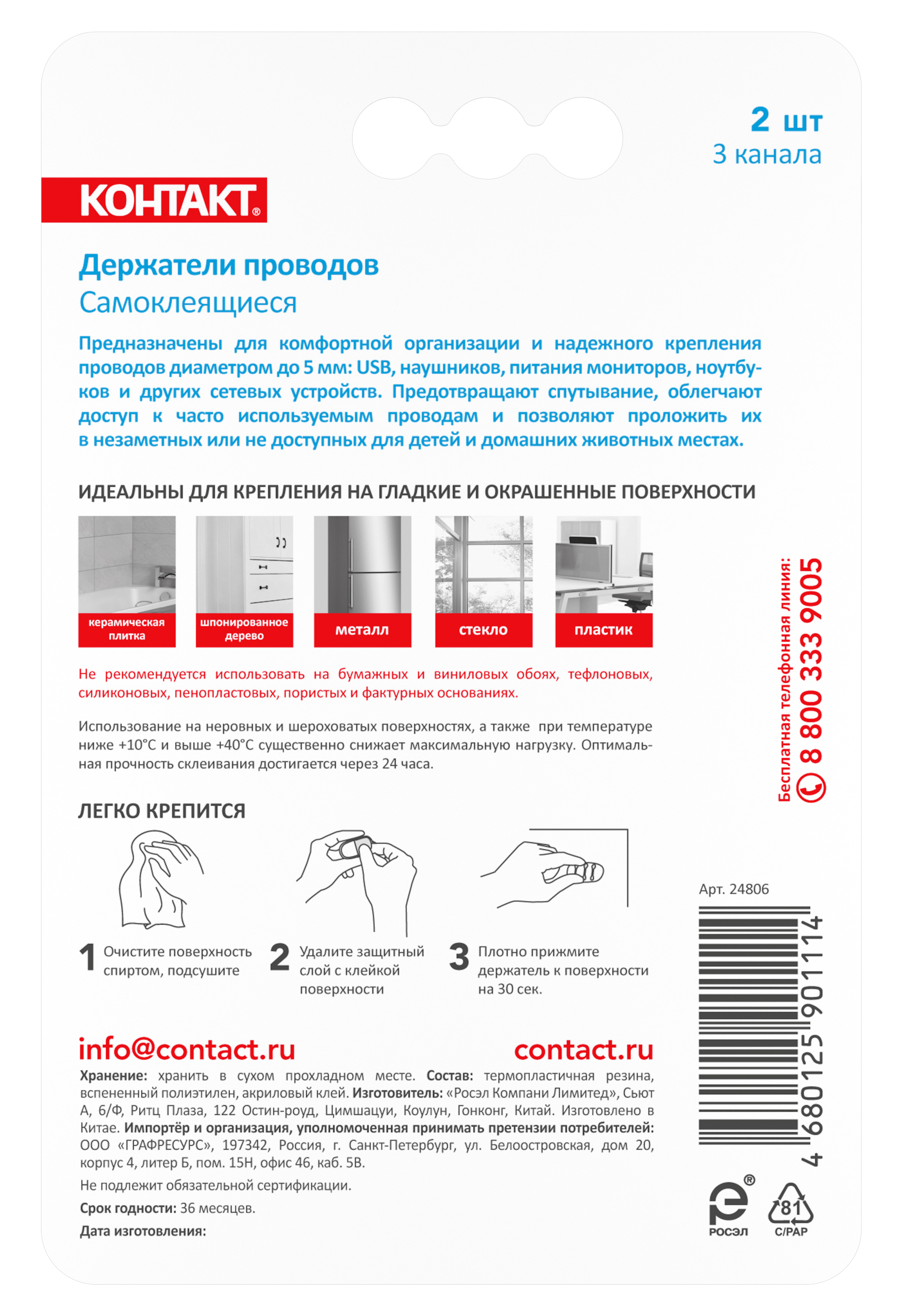 Держатели проводов самоклеящиеся '''', 3 канала, 2шт/уп.