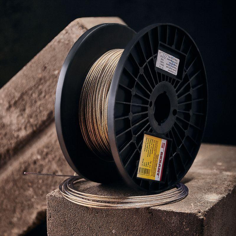 Стальной трос свивается из высокоуглеродистой латунированной стальной проволоки и покрывается ПВХ, что обеспечивает устойчивость к воздействию влаги и пресной воды. ПВХ покрытие является экологически чистым и абсолютно безопасным материалом для человека и животных.