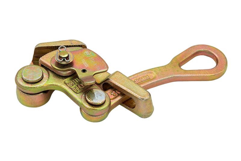 Зажим оснащен хвостовиком с проушиной, служащий для соединения с тяговыми устройствами (лебедки, кабестаны, полиспасты и пр.)