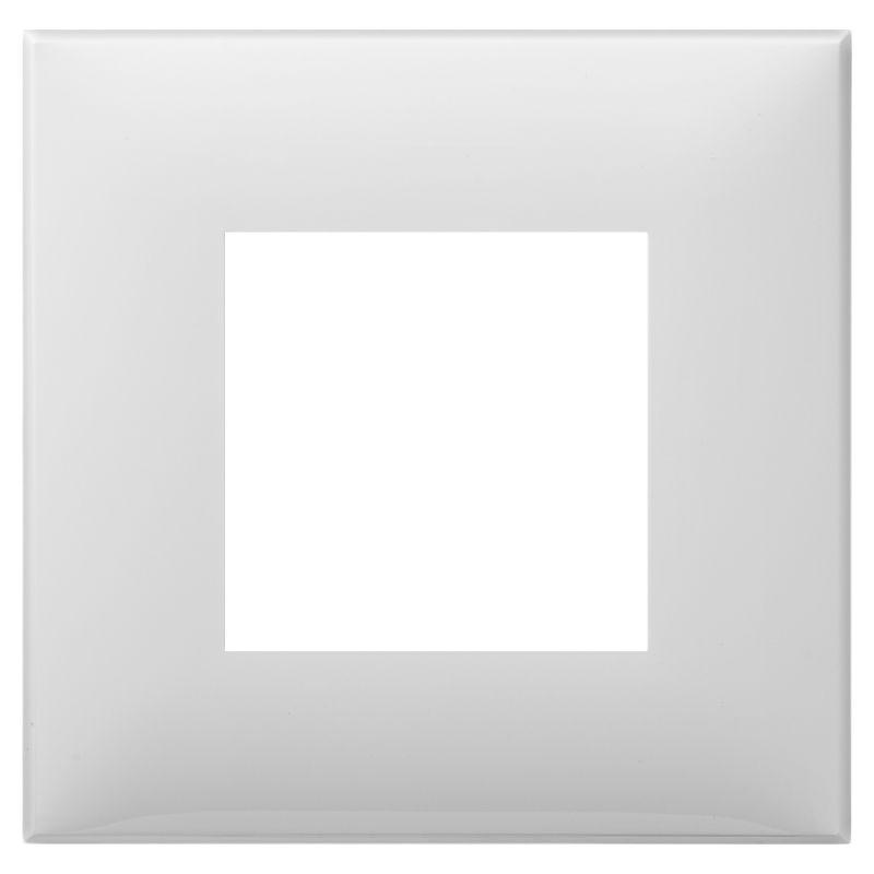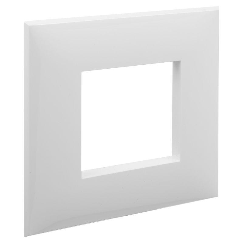 Рамка имеет 1 место под электроустановочное изделие (максимальная вместимость – 2 модуля), может размещаться как горизонтально, так и вертикально. Габаритные размеры: 90х90 мм. Материал – термопласт.