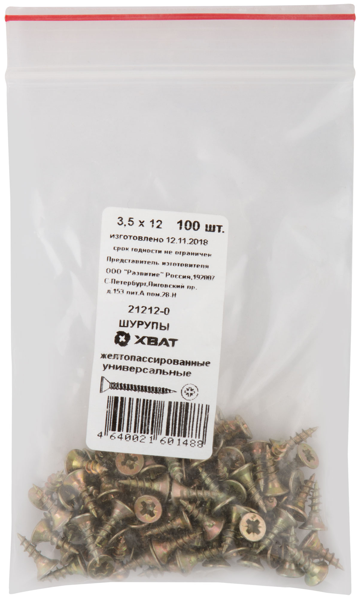 Шурупы желтопассированные, универсальные 3,5 х 12 100 шт Фасовка