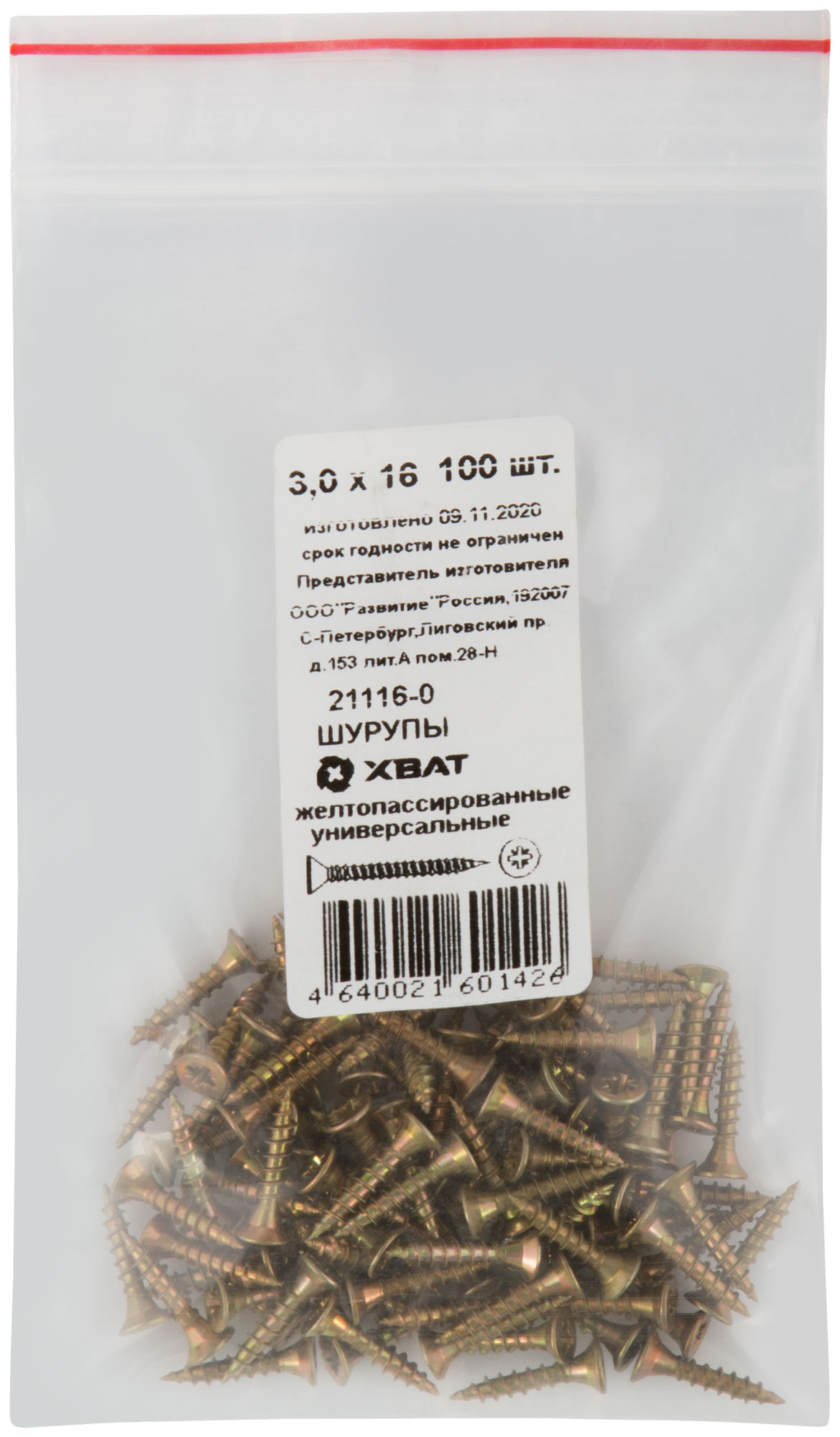 Шурупы желтопассированные, универсальные 3 х 16 100 шт Фасовка