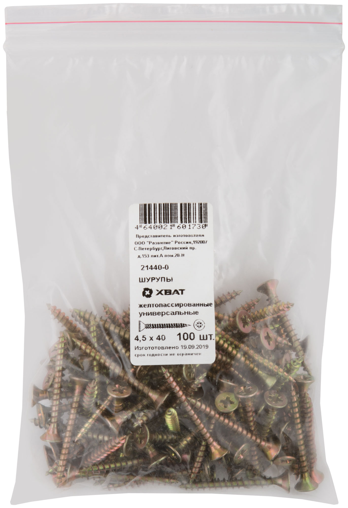 Шурупы желтопассированные, универсальные 4,5 х 40 100 шт Фасовка