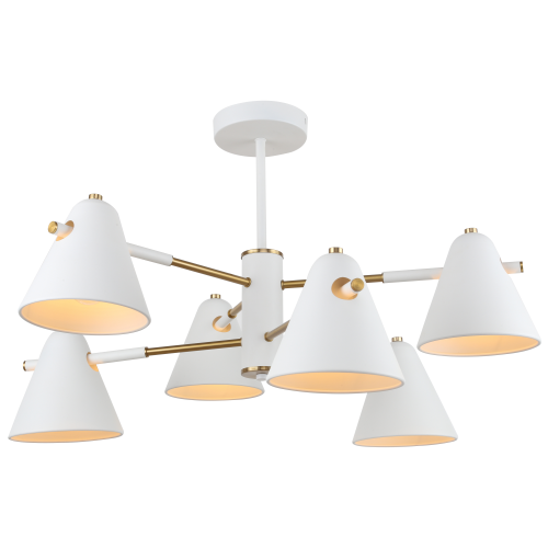 Популярная люстра коллекции – Rivoli Chelsea под 6 ламп. Эта люстра оптимальна на потолок стандартной жилой комнаты. Корпус и плафоны люстры изготовлены из металла и окрашены в матовый белый цвет гальваническим способом. В декоре люстры присутствуют элементы золотого цвета. Свет люстры в гостиную Chelsea направлен вниз, что обеспечит жильцов дома или квартиры качественным ярким освещением с направленным световым потоком. Освещаемая площадь металлической люстры лофт Rivoli Chelsea – до 18 м2.