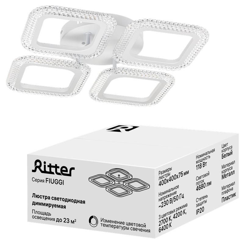 Люстра потолочная светодиодная диммируемая FIUGGI 400х400х75мм 118Вт 2700К/4200К/6400К 23кв.м бел. Ritter 52167 3