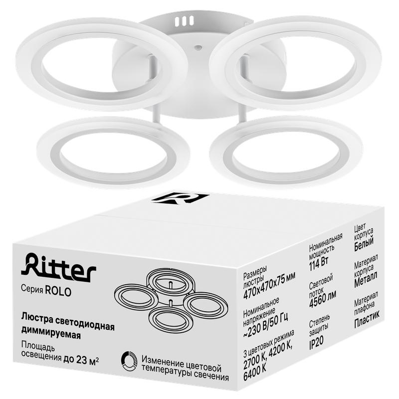 Люстра потолочная светодиодная диммируемая ROLO 470х470х75мм 114Вт 2700К/4200К/6400К 23кв.м бел. Ritter 52200 7