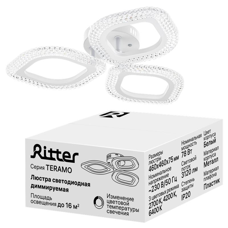 Люстра потолочная светодиодная диммируемая TERAMO 460х460х75мм 78Вт 2700К/4200К/6400К 16кв.м бел. Ritter 52174 1