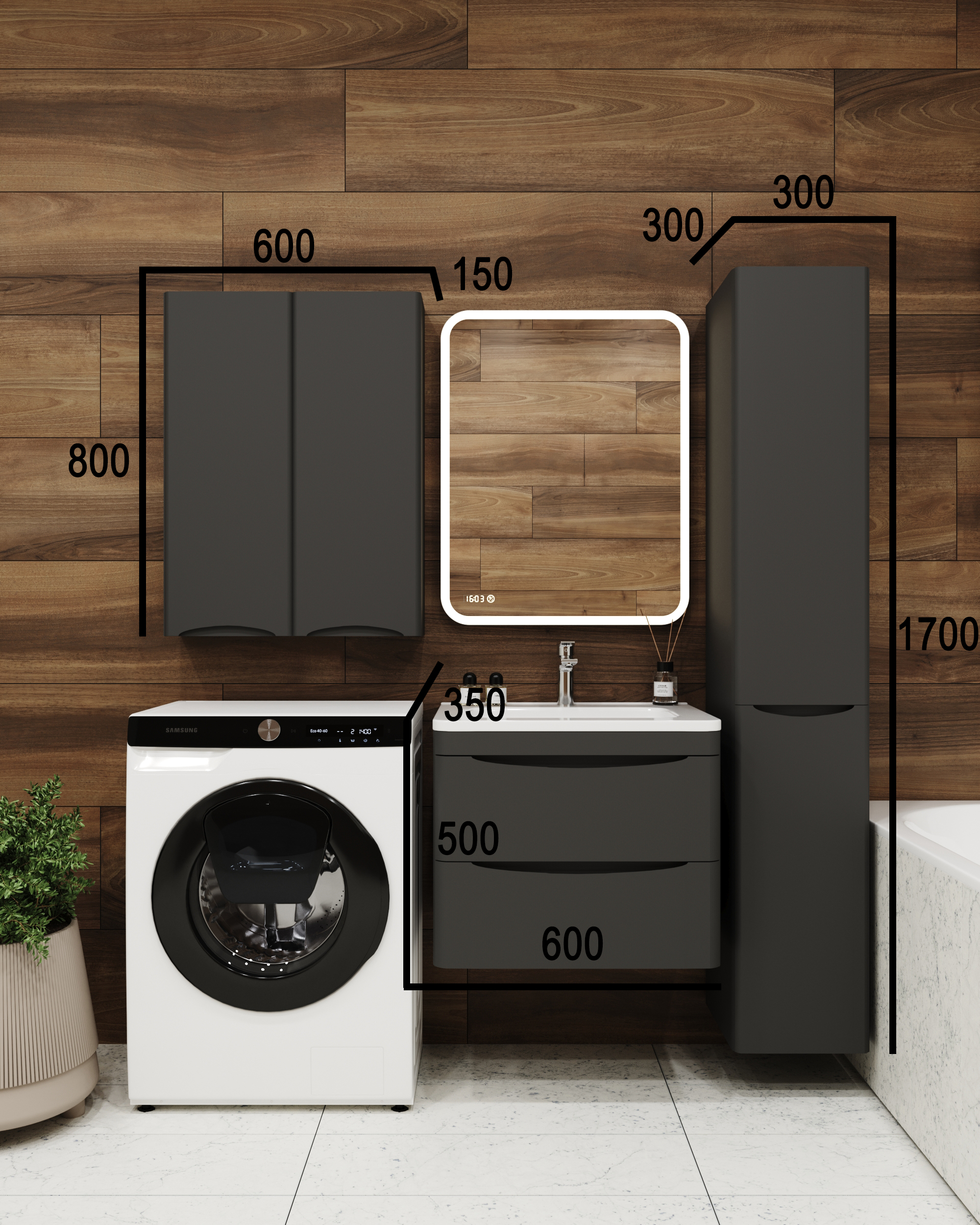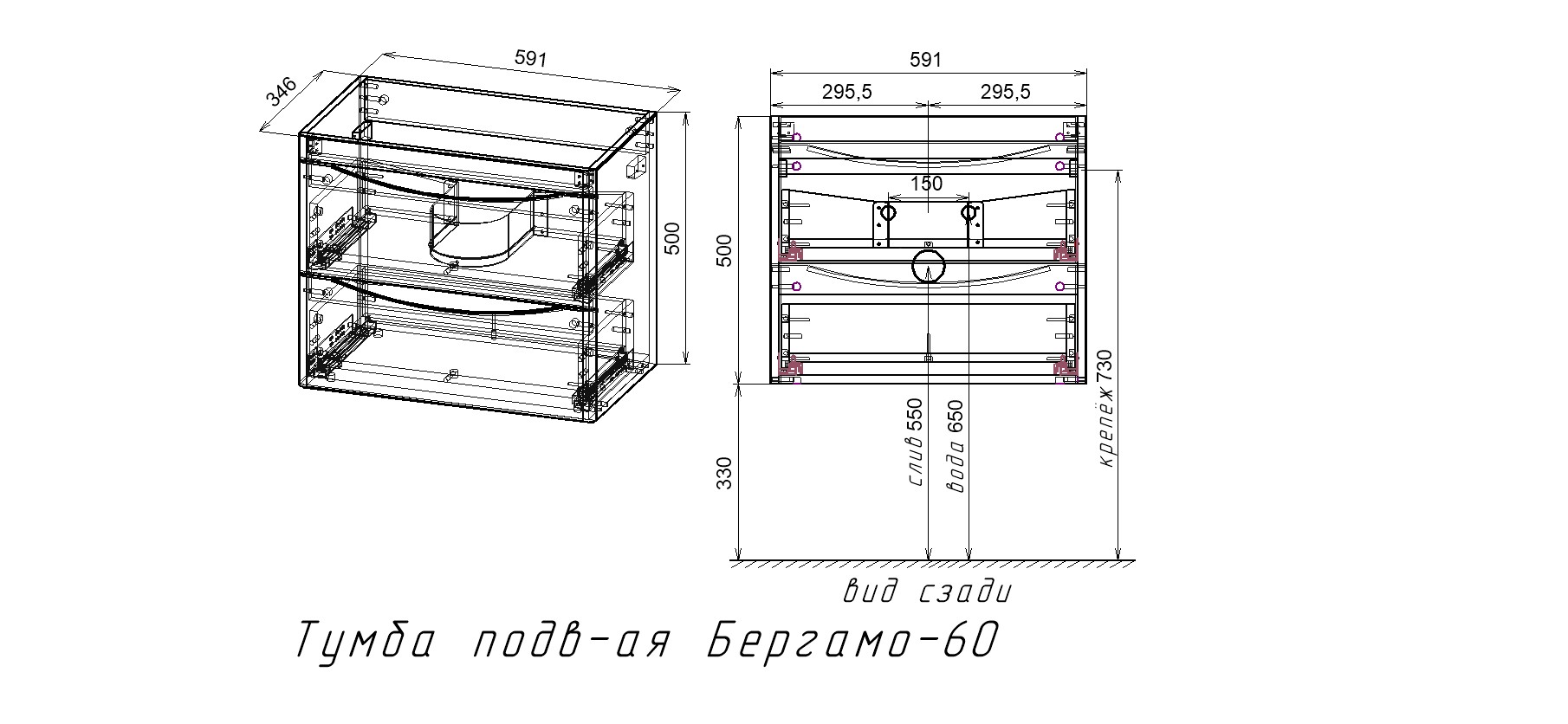 Тумба подвесная "Бергамо мини 60" (2 ящ.) Люкс антискрейтч черный, PLUS