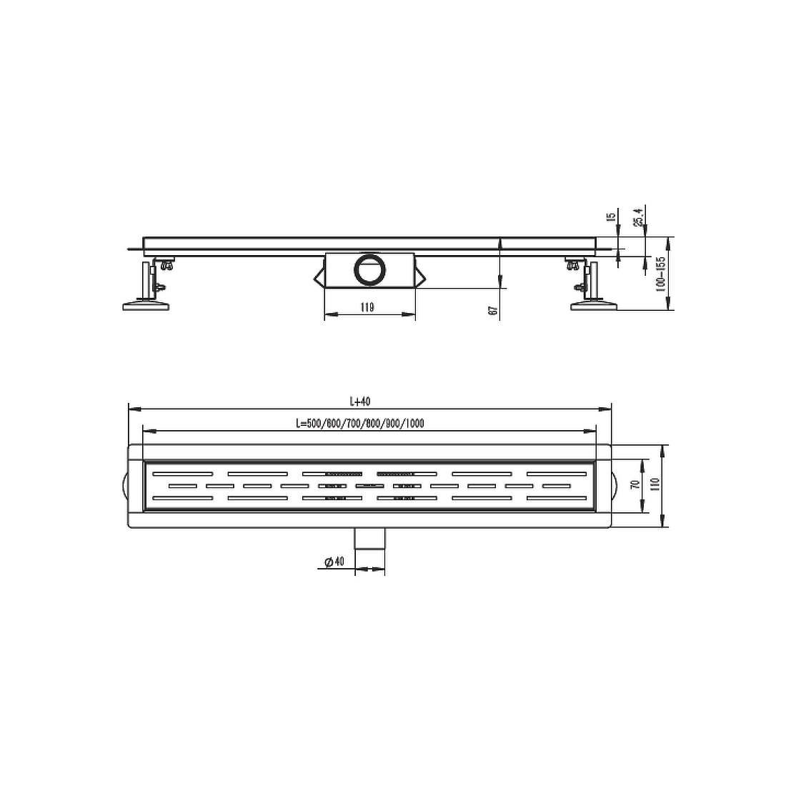 Трап изготовлен из высококачественной нержавеющей стали, в коллекции цвета трапа представлены в нескольких вариантах - черный матовый, сатиновый, золотой, графит. Линейный трап под кладку плитки для душа предназначен для отвода воды с пола или поддона под душем. Широкий диапазон регулировки по высоте позволяет устанавливать трап в новых ванных комнатах. Индивидуально регулируемые ножки обеспечивают беспроблемную установку, даже в тех случаях, когда Вы сталкиваетесь со значительными неровностями в различных частях монтажной поверхности. Трап обеспечивает свободный слив воды в канализационную систему, также собирая мусор, не давая ему засорять сливные каналы. Принцип работы сухого затвора: легкий поплавок диаметром больше сливного отверстия опускается и закрывает трубу в случае высыхания воды. В рабочем положении вода поднимает и удерживает поплавок на одном уровне и система работает, как один из вариантов гидрозатвора. Если трап не используется, то вода из затвора испаряется, а поплавок закрывает сливное отверстие. Диаметр сливной трубы: 40 мм. Максимальная высота монтажа: 155 мм. Минимальная высота монтажа: 100 мм. Выпуск: горизонтальный. Материал корпуса: нержавеющая сталь. Защита от запаха: сухой+гидрозатвор