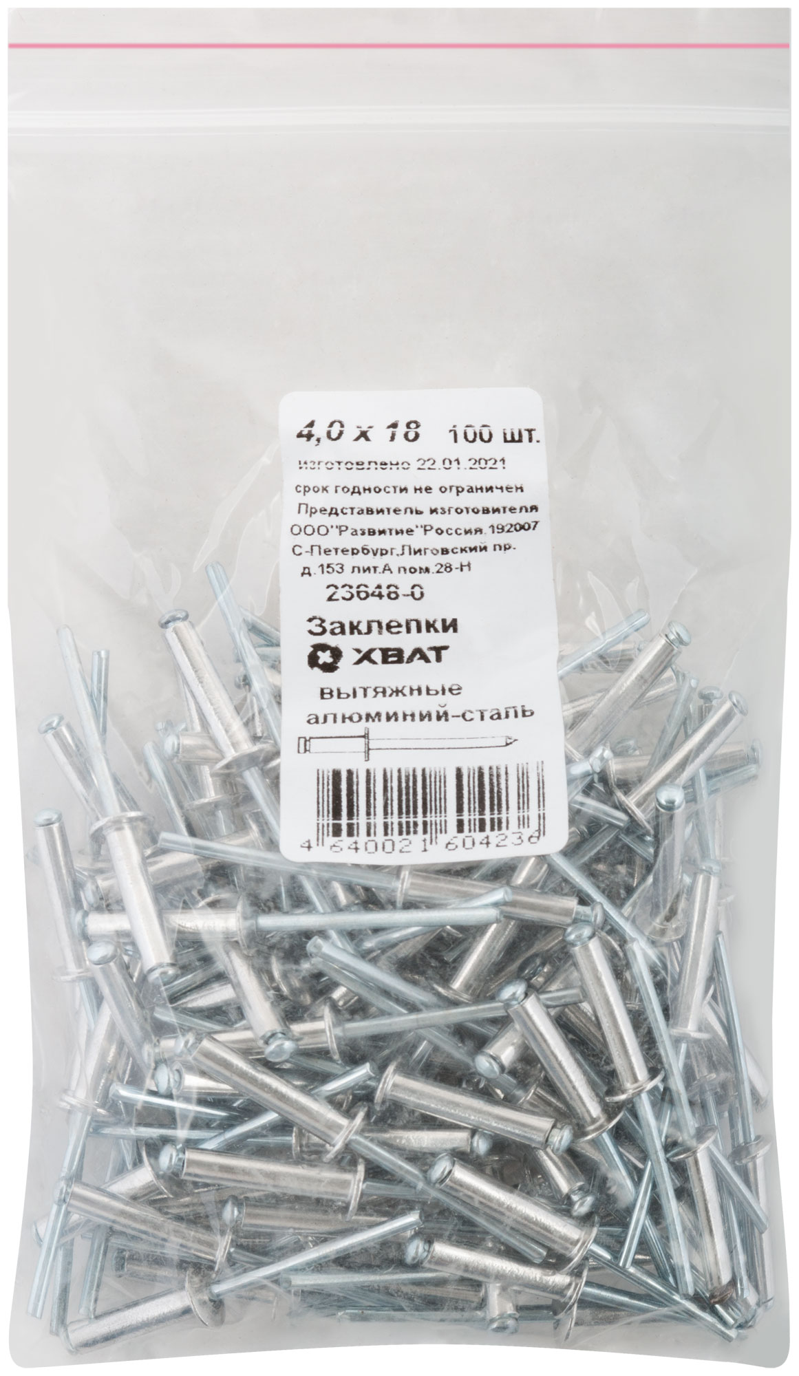 Заклепки вытяжные комбинированные, алюминий-сталь 4,0 х 18 100шт Фасовка